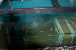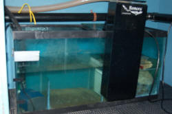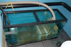 Refugium For Quarantine? 9/15/06 Great resourceful site, quick question for the experts. I am going to use an old 55-glass tank as a sump\refugium for my 75-gallon tank. My current design is Skimmer Left, return center, with the refugium on the right utilizing a higher wall. I am channeling aquarium water to both ends to give the refugium fresh tank water. My question is can I occasionally isolate the refugium as a quarantine tank, or should I design another chamber say 5-10 gallons for this purpose. I intend to have LS, LR, etc in the refugium so I'm not sure if leaving this out of the loop for several weeks would be risky. <Hmm...in my opinion, I'd simply set up a small aquarium for this purpose. Get an appropriate-sized aquarium for the livestock that you intend to quarantine (like a 10, 20 or 40 gallon), "pre-colonize" some filter media in your display tank, and set up/break down the quarantine tank when you need it. The potential for introduction of diseases, even in an isolated section of your refugium, is simply not worth the risk, IMO. Besides, if disease does manifest itself and you have to medicate, there is another potential difficulty. Better to isolate a section of your refugium to cultivate amphipods, mysids, or other food sources, IMO! Quarantine in a simple tank set up remotely just for this purpose.> Thanks - Jeff <My pleasure, Jeff...Hope my two cents was of use to you! Regards, Scott F.> 24G Nano Refugium 9/9/06 Hi Guys, <Mixed sexes here...> I will like to create a refugium on the center compartment at the back of my 24 Gallon Nano. <Good> Option 1: Remove filter and move carbon bag to the first compartment, add a couple of pieces of life rock. No light, no sand, no Chaetomorpha. hopefully this will feed some pods into the main tank... <Hopefully> Option 2: same as option 1 + add a small arm light back there, add rock and Chaetomorpha. <I would go this route> Option 2A: same as option 2 but add sand.... this option is where I don't know what to do.... if I add sand back there it might get into the sponge filters of the first compartment, not sure if this is a problem. should I put it in and open container.... <I'd skip the sand here> are any of the above good ideas...please advice. attached is a picture of my creatures... thanks a lot! Roberto <Mmm, have you read here: http://wetwebmedia.com/refugium.htm and the linked files above? Bob Fenner> Tiny Refugium in Sump ~ Lighting for Chaeto 9/6/06 Good afternoon all! <And to you> I have a 90 gallon salt tank with a deep sand bed 3 - 6". I am in the process of preparing the tank for corals... while eliminating some Cyano. My sump is 33 gallons and the refugium portion is tiny at 12x12 enclosed in 10" baffles and the water level stays fairly constant at about 13". I'm using approx 1" miracle mud as a base. My water flow is about 18x/hour, aggressive protein skimming, and 2x250watt MH with 2x96watt PC lighting on the main 90 gallon tank. I have a ball of Chaetomorpha on order... it arrives tomorrow. Because my strategy is to use the Chaeto for nutrient export, I will be keeping the refugium lighting on 24/7. <Mmm, don't do this... Only a few algae (not this one) can constantly operate illuminated... need the dark reactions of photosynthesis... I'd arrange a RDP (reverse...) photoperiodicity with your main tank... have them overlap...> My questions is, because my refugium is small... I should only really worry about lighting that portion and therefore do not need a fixture that will cover the entire sump, correct? <Correct> I am looking at a lamp fixture with one 65watt 6500K Power Compact. In your opinion, is this sufficient? <Yes> I would keep the lamp fairly close to the top of the tank. On a sidenote, my water temperature in the main tank has a low of about 27oc and with metal halides on, rises to 29/30oc. Is this an acceptable fluctuation for my fish and eventually my corals? <Mmm... no is more than border-line too much diurnally> I'd hate to have to invest in a chiller just to drop my temp 2oc. <Look into other technology... fans, passive cooling methods... covered on WWM> Thanks! "DIE CYANO DIE!" hopefully.... Dave <Oh, and please read here: http://www.wetwebmedia.com/refugltgfaqs.htm Bob Fenner> Re: refugium 9/5/06 Just wondering if a 20 gallon long tank is ok to use as a sump/refugium for a 58 gallon oceanic tank, Thanks Ron <Oh yes... appreciable benefits. Bob Fenner> -Wet dry to Refugium- 8/28/06 Hi there; < Evening> New to this site and have been looking into changing my wet/dry over to a refugium. I have a 75 gallon tank with about a 20 gallon sump which houses the bio balls (I know get rid of them) and a protein skimmer. <You do not "have " to remove them, depending on your bioload and maintenance regimen of water changes, a wet dry can be a very good filter, just becomes a nitrate factory and most tanks have that issue as it is :)> I have two options that I am looking at here. Option one is to take a 20 Gallon long tank, have the overflow from the main tank drain into a compartment with live rock, then baffle the tank from there to allow the water to flow into the DSB and fauna area then pump back to the main tank. I am concerned about this method though because I will have to really slow down the return volume to the main tank to allow the water "dwell" time in the fuge. I thought that a slower water turnover back to the main tank would affect the dissolved oxygen level of the main tank and affect the health of my corals, or would this be a mute point because of the "oxygen" added by the fuge to the water? <This method works, and while the flow isn't conducive to tons of copepods and other micro fauna going crazy in the higher flow; It will certainly work. If you want an all in one option this works, and works well, Vie seen a rate of flow at 500gph through an 18" long sump setup similar, and it runs my friends reef and puffer tank which both share a sump just fine. Your concern for oxygenation is unfounded as