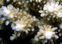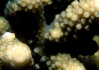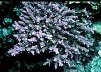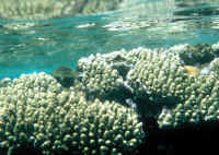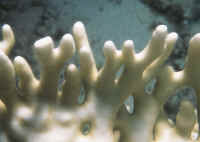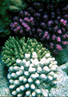 Stinging-Celled Life, Phylum Cnidaria: Due to the vagaries of variable wave action, insolation (light and heat from the sun), and other factors, the upper reef flat is a place of harsh and dynamic circumstances. As you can appreciate species diversity and abundance are more limited here than just "over the edge" of the reef lip and slope. Nevertheless there are robust species that dominate this zone. Mainly the Stony Corals, Order Scleractinia, of the following families. Family Acroporidae: There are three genera of Staghorn Corals in the Red Sea; Acropora, Montipora and Astreopora. The first two are the predominant life forms on the reef flat and may continue to be so "over the edge". Genus Acropora: Some seven to fifteen species are described from the Red Sea, depending on which reference one follows. A. lamarcki (formerly corymbosa), A. hemprichi, A. humilis are regularly occurring, abundant species. A. haimei can be found in very shallow water, dominating at times.