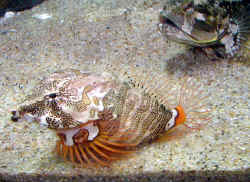 Grunt Sculpin 12/3/08 Mr. Fenner, <Hannah> I recently traveled to a zoo with a group of fellow honors students. We were told to find something there to give a presentation on. Out of all living creatures at that zoo I was captivated by the grunt sculpin (Rhamphocottus richardsoni). I decided that although I didn't even know that such a thing existed, I HAD to write and give a presentation about it! I know very little about the sculpin except that it is (I believe) in the family Cottidae. <This is so> I stumbled across WetWebMedia.com in my search for more information and was relieved to find someone who knew what they were talking about (the employees at the zoo were not helpful). I wondering if you have any information and/or links to information about the Grunt Sculpin. If you are able to provide information about them, would you permit me to site you and the information in my presentation/paper. Thank you for your time, Hannah S. <Mmm... likely some old standards like Miller and Lea bulletin 157 and Sam Hinton's classical works on intertidal life will have a bit as well... But, 't'were it me, I'd use your enthusiasm as a springboard here to learn how to search the literature period. Easy to do, esp. with the help of a friendly reference librarian... at a local college library (with a life science section). Please take a read here re: http://wetwebmedia.com/litsrchart.htm and the linked files above. Oh, and do write back if you sense a desire for a bit more input. Bob Fenner> Re: Freshwater stonefish Hi Bob <Hello there> Thanks for getting back to me. I have been to your site before and our stonefish seems to be quite different from a toadfish. I asked the supplier and he said they aren't toadfish, or Bullroats, and their proper name is a freshwater stonefish. They come from West Africa. <Ah, a clue. Mmm, placed the common name "freshwater stonefish" in fishbase.org, nothing... and in the country listing (western Sahara, no designator for western Africa)... with no eastern Scorpaeniforms other than a couple of triglids (the Order Scorpaeniformes includes the marine Stonefishes, the triglids are Sea Robins)... as far as I'm aware there are no freshwater "Stonefishes" at all... but as Shakespeare wrote, "what's in a name"? Someone could have just "made it up" (happens all the time). I would go back to your supplier and ask them in turn to pull out their invoice, contact who sent the specimen to them and have them help identify this fish to species (or at least family). I suspect it is either a batrachoidid (toadfish) or cottid (sculpin) both of which have freshwater (and brackish, often sold as fresh) members.> I know the basic water quality conditions that they need, I just wanted extra information on the species. <Glad to find that you want such information.> Thank you for your time and help, Regards, Kerri <Good luck in your search. Perhaps you can send a pic along? Bob Fenner> Re: Cottus Do you have a copy of "Breeding Cottus bairdi" by D.H. Lewis? <Unfortunately no. Bob Fenner> How would a lion fish and an Oscar do together hello, I have been doing some research on lion fish freshwater i would like to know if the lionfish would get along with a Oscar ..I was wondering if you could tell me anyway possible how to care for one i have a 55g fw aquarium. I always wanted one when i was little so if you can please email me back thank you for your time Christopher <Hard to make this combination work due to Oscar's much more aggressive feeding. Please see here: http://www.wetwebmedia.com/sculpinfaqs.htm I encourage you to keep these fishes in separate systems. Bob Fenner> Re: freshwater lionfish I bought this fish from a petstore but they seemed to know nothing about it. They said that they just got it in and that it is a rare fish for sale. They advised that it would probably eat frozen or pellets. I have had the fish for 3 days and have seen it eat nothing. I put guppies and a dozen ghost shrimp in the tank but it hasn't shown interest either. What do they eat? <Ah my friend, you have much more to learn than what they eat. Do you think this is a freshwater fish? Did you do any research before purchasing this animal? NO? Shame on you! Here, try this to start with from WWM..."And as regards the 'Freshwater Lionfish' sold in the trade; these are actually Sculpins, family Cottidae, related not too distantly to scorpaenids (in the same Order). For the record, besides not being Lionfishes, they are not venomous, or freshwater. There are some sort-of brackish water Scorpaeniform fishes, like the Bullroats, that do make forays into freshwater, but they are not permanent residents." Try: http://www.wetwebmedia.com/cottidae.htm and http://www.wetwebmedia.com/sculpinfaqs.htm There is much to learn and do. What size tank do you have. Filtration protein skimmer? This is not a freshwater fish....he needs marine salt, water testing, hydrometer, etc. Follow the links and FAQs above. Good luck! Craig> Freshwater Lion Fish Hi I just recently bought a fresh water Lion Fish Nobody can tell me how to care for him or what to feed him I cant seem to find out anything about the fish all I find is about salt water Lion Fish mine has been staying at the top of the tank in some plants that float and he doesn't move I keep checking to make sure he isn't dead and he barks at me and move a little but he doesn't eat I did put some guppies in the tank today but he hasn't eaten them either and I would like some information on this type of fish before he dies from not eating. Thanks for your help. Michelle <Actually, this species is a brackish water Sculpin... Please see here: http://www.wetwebmedia.com/sculpinfaqs.htm Bob Fenner>