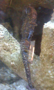 Pipefish/Health 1/24/09 Hi there! <Hello Cai> I had two Corythoichthys sp (probably intestinalis). When purchased they seemed healthy, and as I placed them in my 128 litre (appr. 30 gallon) tank they were the only fish in there. I have had the tank going without fish for quite a while and it has a very good pod population. The pipefish were actively eating, until about the fourth or fifth day I found that they had changed the behaviour pattern. From being actively swimming around they were laying on the sand or LR and then sporadically swam around very fast for a short while after which they again settled on the sand. The next morning one of them was dead, to be followed by the other two days later. One of them was on its back upside down before it died, which I do not think is natural for pipefish. There were no marks on their bodies on either of them. I have come up with two possible theories on their deaths (btw the water is fine, I tested it afterwards). 1) There is a pistol shrimp, Alpheus sp. I have seen it and it is about1,5 cm in length. Could it have defended its cave with snapping and thus brought some inner damage for example to the swim bladder that caused the behavioral change before death. <Is quite possible.> 2) They were so hungry from having a fairly sterile tank in the LFS and when they got in my tank they simply ate themselves to death. This could also explain the behavioral change, though I have not found any references of this on the web. <Pipefish are relatively slow eaters due to their small tubular mouths and is unlikely they died from overeating as most folks recommend a constant supply of pods in their tank and here is where a refugium can be beneficial. This in turn will help simulate nature as they do forage for food continually. They are relatively easy to keep providing proper food and system requirements are met. Outside of the possibility of the pistol shrimp causing any harm, I really do not have an explanation. If the swim bladder was affected, they likely would have a hard time staying on the bottom. Other crew members may chime in here with their input. Should you decide to have another go at pipefish, do read the link below. You may find the information beneficial on your next attempt should you so decide. http://reefkeeping.com/issues/2003-04/hcs3/index.php Thanks, Cai, Kirkkonummi, Finland <You're welcome. James (Salty Dog)>