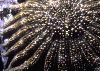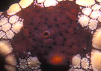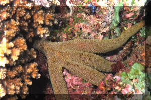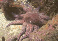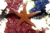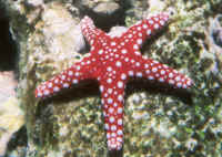 Selection: Specimens of several genera are commonly offered in the trade, and more unusual species may be special ordered through dealers. What to look for or look out for? The individual in question should be lively, moving and turgid-bodied, with tube feet visible in the case of Sea Stars. A good test is to turn the animal on its back and see if it rights itself. A limp or weak individual is a poor aquarium prospect. Some may eventually recover, but many do not. Most losses of these, and other spiny-skinned animals is subsequent capture and handling trauma. Other warning signs are dark or whitish necrotic matter and vacuolations (missing areas). Lost arms are common and will eventually heal over, but it is unwise to buy a specimen that is freshly wounded as infection and rapid decline may follow. Note: not at all rare are "comets", detached single arms that are regenerating new bodies. This is seen as a large arm with a small body and a set of small arms at one end. These are often very good specimens.