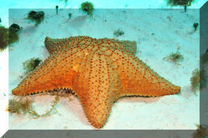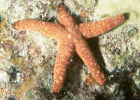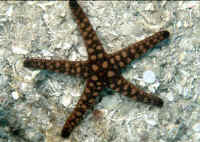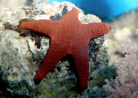 Echinoderms are notable as the only animal phylum with no parasitic members. They are hosts to many parasites themselves, however, particularly copepods and gastropods. You should check a prospective buy for any attached or obvious internal parasitic problems. Some Fave Groups, Species for Marine Aquarium Use: The most common error in selecting Sea Stars is acquiring species that get too large or are ravenous omnivorous predators. Not only will many species attack various types of reef invertebrates and fishes, they often can't get enough to eat even this way! Unless you are willing to make a special effort to house and feed the larger, predatory species, it is best to star with "reef safe" choices. Among the industry favored species are the very attractive Sand Sifting Star, Archaster typicus, the Little Red Starfish and Orange Marble Starfish (Fromia elegans and Fromia monilis respectively), Blue Starfish (Linckia laevigata), and Purple "Linckia", Tamaria stria. A note of clarification here: these are not necessarily the best suited species for aquarium use. "Regular" Linckias/Linckias in particular are generally short-lived. The genera and species below are our choices for most suitable.