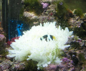 G> Anemone stays upside down My Sebae looks so pretty when it's inflated but that's not very often. Most of the time it's inflated and sometimes on it's face. I have to Ocellaris that love the anemone but I'm afraid they're stressing it too much. < Very likely. I would try putting a plastic basket (like the kind strawberries come in at the store) over the anemone keeping the fish out; to see if that makes a difference. > What can I do to help the anemone? < If that doesn't fix it, it is not a fish issue but a water quality issue. In that case monitor your tank for changes. Also, be sure the anemone has plenty of light and space around it. > Should i upright it when it's on it's face? < Tough call. Usually I don't, but if it is still upside down after a few days, then yes I would try to help it out. > < Blundell > Heteractis crispa, Sebae anemone color, health I was looking at your site and it said that sebae anemones are bleached out when they are white. <Yes, generally> I had one for about 2 months and is perfect but white. Is there anything i can do to bring back its zooxanthellae. <Good care, feeding, patience, adequate light, current, good water quality, the presence of other cnidarians that might "lend" some algal symbionts...> I feed it once of one cube of Hikari Mysid shrimp. It also has a sebae clown hosting in it. I want to attach a picture of it, but you guys never receive the mail. <?> thanks Joe <Do read over all the materials posted on Anemones on WWM... Bob Fenner> Anemone Conundrum, lack of