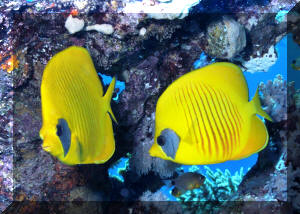 Amongst a mix of suitable species of Butterflyfishes hailing from the area, the Blue Mask or Semilarvatus (Chaetodon semilarvatus) Butterfly ranks supreme. It is superlatively suited for captive use amongst its family members in the Red Sea; accepting worm, crustacean, small mollusc and zooplankton type foods, bearing up well under conditions of capture, holding, shipping and processing, and in more modern times, coming down in price to suit a broader range of pocketbooks. About the only trait/characteristic working against its selection, is its "up to plate size" potential growth. There is the usual "mix" of appropriate and not species of Chaetodontids (the family of Butterflies, meaning "bristle teeth"... in reference to their prising jaws, modified for picking out small animals in nooks and crannies) in the Red Sea... Some like our star species here are "good" choices for aquarium use, being generalized omnivores... taking all kinds of foods readily. As you will find below, there are some "medium choices" that tend to not adapt as well to captive conditions, more than half perishing historically within a month of capture. And lastly there are the resounding "poor choices", those that do dismally in most cases, more than half dying within a week in captivity. This last group of largely obligate corallivores (i.e. only feeding on live coral polyps) should be avoided, or only tried by folks who know ahead what they are up against and are able, willing to meet the needs of these touchy species. Classification Notes: The Butterflyfish family Chaetodontidae are a very important part of the marine aquarium world. Several species are 'stock' items (the Longnoses, Raccoon, Threadfin, Heniochus, among others) due to their overall beauty, adaptability, availability, and hardiness against disease. There are, however, many varieties of chaetodonts that are near impossible to keep in captivity. Some are known to only eat live coral polyps, others just don't take captive handling and/or life in a small artificial environment. Of the 'good' B/Fs (industry shorthand for the family of butterflies) there are more than a handful that can be gotten from the Red Sea. The following is my tally of the best, medium and worst varieties; my opinions from handling thousands of specimens, traveling and writing in the interest of aquaristics for going on thirty years. Our "Shining Star", The Golden BF: