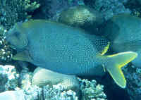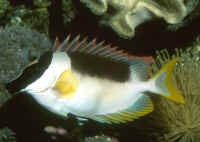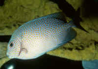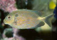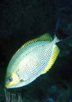 Selection: General to Specific Size is a strong criterion; smaller individuals are more colorful and adapt more readily to the vagaries of aquarium life. An ideal range for purchase is somewhere between 3-4 inches overall length. Color can be deceiving as individuals are very labile in changing such with their immediate mood. A "happy" specimen is to be selected for, but don't necessarily disqualify a fish as unsuitable due to temporary fright or nighttime coloration; they change dramatically and fast. Damage like red spots contraindicate a purchase, though torn fin membranes are not a danger sign, and quickly repair. Environmental: Conditions Habitat Of the twenty seven described species, 13 are open-range schooling, with the other 14 mainly living among coral reefs. How to tell which you're looking at? See above, trust your dealer, read up, look at enough printed images, get a very large tank... The species currently offered in the trade (and all the others I've had occasion to view in Public Aquariums) generally adapt supremely to captive conditions. All should be offered sufficient caves and crannies for shelter. Chemical/Physical: Filtration Rabbitfishes are not particularly fussy as regards general water quality. Due to their continuous daytime browsing and waste production, medium to strong circulation and oversized power filtration is a plus. Display Of the few dozen species of marine fishes our service company used, the Foxface, Lo vulpinis was a ready favorite. Though shy, its inquisitive nature and bright pattern made it a finger-pointing favorite of customers and their visitors. Two conditions allowed for successful keeping and show; a large, and stress-free environment. Physically the tank has to be big for swimming and growing space; and emotionally tankmates have to be matched that are not too rambunctious. We employed many 75 and 90 hexagons and 60 plus gallon regular tanks with Lions, gentler Tangs and Batfishes with Rabbits. Behavior: Territoriality Due to their venomous spines and readiness to use them, most predators give Rabbitfishes wide berth; alternatively, they are typically casual toward other fishes... with one exception; members of their own kind. Though many species school together in the wild and may be presented to you as more than one to a tank at the dealers, you are best advised to maintain them solitarily (or as a pair if they are) unless blessed with a system of several hundred to thousands of gallons in volume. If you must have more than one specimen, or species of siganid, provide plenty of crevices, do your best to place them all at once, and/or select individuals of different size. Introduction/Acclimation First a note re netting: as with other venomous aquatics, I strongly suggest you utilize two nets to direct these fishes into a stationary underwater container (jar, specimen box, bag), rather than lifting the animal into the air. Do not risk painful envenomation by cradling or placing your hand in harms way, gloved or not. Punctures are painful, immediately, and may require medical inspection. Once the fish is "home" it is best placed and left alone unfed in an unlighted system for a day. Rabbitfishes are one of my exceptions to the general rule of quarantine; most are clean and ready to go with just a preventative freshwater dip. Put another way, moving them again is not worth the damage that the small potential for disaster warrants from simple introduction to the main/display system. Predator/Prey Relations Rabbitfishes are not to be trusted with non-fishes as their grazing habits often extend to macro-algae, and invertebrates of all kinds. If you employ a small individual to keep your reef system tidy, do keep your eye on it should it sample your corals, et al to destruction. Reproduction, Sexual Differentiation/Growing Your Own: There are reports of aquarium captive spawning brought on by changes in water depth and salinity; and evidence of estuarine reproduction in the wild in some species. Several species are regularly spawned by mariculture concerns as food fishes. Like the other families in their suborder (see above), siganid young pass through a transparent planktonic larval stage termed the acronurus. Some species show difference in color and size, females being slightly larger, less colorful, when about the same size and age. Feeding/Foods/Nutrition: Types, Frequency, Amount, Wastes Rabbitfishes have small mouths specially adapted for browsing on their principal food, algae. They must have rough or prepared vegetable material in their diet daily. This is not to dissuade you from offering meaty, flake or even pelletized foods as these are largely accepted; but without their greens Siganids tend to dwindle and fade. Disease: Infectious, Parasitic, Nutritional, Genetic, Social The Rabbitfishes are amongst the most sturdy, disease-free animals the hobby can get; they are generally the last in the tank to die from any given cause. Close: The Rabbitfishes are not as showy or outgoing as marine Angels or Butterflyfishes, but don't pass them off as undesirable aquarium specimens. They readily adapt and make hardy additions; just remember the poison glands at the base of their spiny rayed fins when handling these fishes. Bibliography/Further Reading: Baensch, Hans & Helmut Debelius, 1994.Marine Atlas, v. 1.. Mergus, Germany. Burgess, Warren E., 1977. The genus Lo. TFH 10/77. Burgess, Warren E., Herbert R. Axelrod & Raymond E. Hunziker III, 1990. T.F.H. Publications, Inc. NJ. Jones, Lawrence Lee Cooke, 1981. A review of the Rabbitfishes. FAMA 10/81. Nelson, Joseph S., 1994. Fishes of the World, 3rd Ed. John Wiley & Sons, NY. |