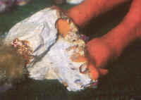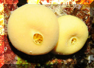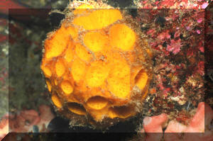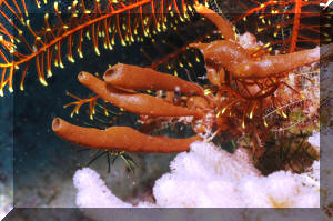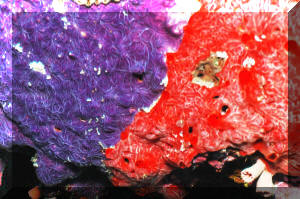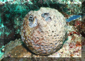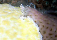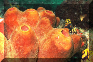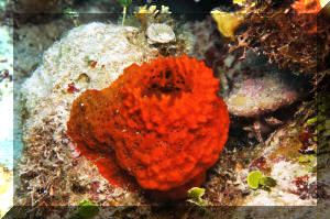 Has the specimen been exposed to the air? It should not be! Air is easily tapped inside the many channels inside the animal, ostensibly killing off those parts. Sponges should never be lifted out of the water! "Bag" and move them underneath the surface. The excurrent (outflowing) "mouth" (oscula) of the sponge should be open, indicating internal activity/water flow. Impugned sponges "close up" their exits. Purchase sponges with little or no "dead" areas, grey or whitish masses. If possible ask the dealer to cut out bad spots and "hold" the prospective purchase for you if/while it is regenerating. Living sponges are relatively firm, well (consistently) colored, and do not "smell bad". Stinky, limp and blotchy-colored ones are probably done for. Buy from a reputable dealer, who knows what sponges are and is willing to "cure" them for a week or more for you in order to assure their vitality and acclimate them. If you purchase "live-rock" for a reef system, you may well be purchasing a considerable amount of live sponge material "free". If some of your sponges start growing, encourage them by placement in a sump, refugium (out of the light if they're non-photosynthates), away from predators. Sponge growth is generally a sign of a viable, healthy system and in turn, Sponges help to keep the biological balance. Environment: Most sponges offered in the trade have broad environmental tolerance, nevertheless a few broad conditions apply: Your chances of keeping live Sponges are much enhanced by placing them only in well-established reef systems; among other reasons to assure the organic material and bacterial populations to nourish them. Tied in with this idea is not to be over-zealous regarding absolutely "pure" system water quality. Use of silicate removing chemical filtrants and "super-skimming" and/or ultraviolet sterilizing is counterproductive to Sponge culture. Placement is very important. Sponges engage in "chemical warfare" as celebrated as the Soft Corals. They should be put out of harms way of all stony corals and provided with growing room around them. Encrusting forms must be provided with a "break" in their substrate to stop them from spreading. Maintenance of sponges is pretty simple. They do need to be "vacuumed" or "blown" clean of detritus, gravel and "gunk" periodically. Adequate light and feeding are the most important factors in success, once a healthy specimen has been secured. About lighting: Some reef-building species (e.g. the bright purple and blue genera Halichondria, Callyspongia and Dysidea) prefer bright direct red-end-shifted lighting. The majority of species offered exist in low light habitats and should be accommodated likewise. If algae are growing on your sponges, something is wrong: Placement, photo-strength, duration, quality and/or nutrient levels are out of whack. Greenish specimens may be harboring symbiotic algae (zooxanthellae) requiring more light. Non-hermatypic species should be placed in low light, and especially out of the light should filamentous or encrusting algae appear on them. A strong current is appreciated, from power head(s), filters, air-lifts... Pay particular attention that any matter not stay on your sponges surfaces. If circulation doesn't wash off sand, food, what-have-you, gently siphon this material off or blast it with a handy powerhead. Behavior: Predator/prey relations: Many opportunistic omnivores will chomp on your sponges. The Dwarf Angel genus Centropyge generally are not too bad, but the larger pomacanthids make up a considerable part of their diet in sponges in the wild. Some species of Filefishes and Triggers are also known sponge munchers. Nudibranchs, Cowries and several other mollusks are not to be trusted carte blanche. As usual, you will have to experiment and be observant! Toxic Sponge Effect: Some Fire and Red Ball sponges are known to produce a "wipe out syndrome" if injured or sufficiently disturbed. On introduction, mixing water, disposing of most mixed water and careful placement are warranted. By the by, some "fire" sponges are toxic to humans as well; wear rubber gloves where/when in doubt. Symbioses: Partners and Parasites. All manner of other life lives in and on (Shown, Istrochota and zoanthids) Sponges, (or their remains). Crabs (shown, Decorator Sponge Crabs that attach Sponge for camouflage and its bad taste), lobsters (Shown, gobies and lobster in Sponge), starfishes (show Basketstar, Astrophyton muricatum in and on Sponge/feeding at night), real fishes, worms, crinoids, Sea Cucumbers, and they in turn grow on and through other organisms. These relationships are typically commensal, but they run the gamut from predatory, parasitic to mutualistic. Reproduction: Sponges are known to reproduce in several ways, sexual and asexual. They have several variations on "budding" and "fragmenting" themes as well as produce eggs and sperm released into the water column with meteorological and chemical cues. Some develop planktonic young, others are fertilized and develop internally. Though sponges will spread and reproduce asexually on their own, they can be easily "fragged" by cutting off a piece of an established, stable colony and tying it to a piece of rock with a piece of fishing line. This should only be attempted with large-enough colonies and never in conditions that favor micro-algae growth. Foods/Feeding/Nutrition Sponges are largely filter feeding organisms, constantly whipping their (choanocyte) flagella, sweeping in food (bacteria, organic matter and phyto- and zooplankton) and oxygen and creating an excurrent stream flushing out carbon dioxide, other wastes and occasionally gametes. Poor nutrition is a close runner-up to inappropriate collection as the number one source of sponge mortality. Some writers suggest not feeding tropical reef sponges, but unless your system is established well enough (from Live Rock and Sand) to support its other filter feeding organisms without supplemental feeding, I would;