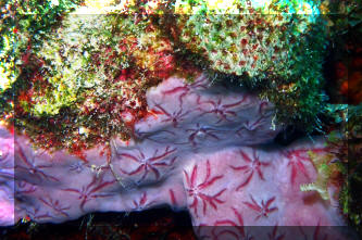 to Lavendar and lumpy to rope-like; often using Gorgonians as support. 4-16
