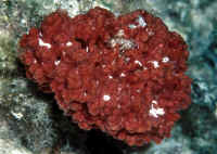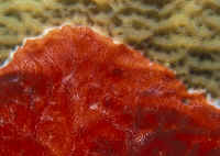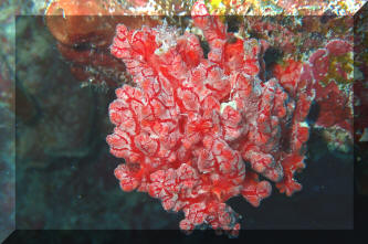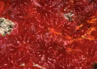Sponge. Bright red to pink thin-walled sheets, with darker radiating veins from excurrent