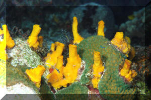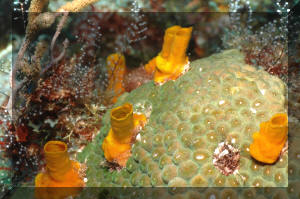 Sponge. Groups of white tubes of four or less inches. Found under ledges in