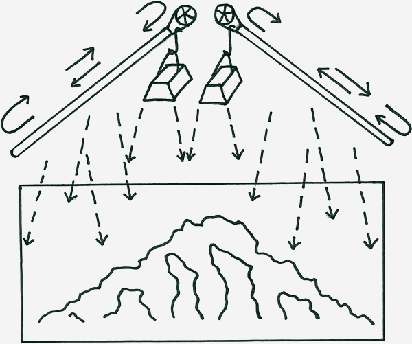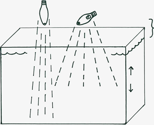 caption: The orientation of lamps is an issue of great importance both efficient operation (value/efficacy) and reef health. Pendant installations (at left) produce light in a very focused and narrow range with limited spread. They are best suited to tall/deep and narrow displays or aesthetic effect. Horizontal placement of lamps (at right) works best for most aquarists with aquariums under 30" (<75 cm) as it delivers a wider spread of usable light. At last, we come to an address of moving light systems. With consideration of the above aspects (and their application of most here, just the same), we take reef lighting to another level… or rather, other dimensions in space literally as we depart from traditional fixed stations for lamps. For the sake of this primer, we'll limit the detail of hardware simply to planar (illustration at top of article) and inclined light tracks (see below). Advanced aquarists have and will continue to experiment with numerous interpretations of the method. Indoor horticulture has long since employed suspended lights on motorized planar tracks. If you have never seen them in operation before, they are really as simple as they sound: a motorized track with gears/pulleys conveys a fastener (hook or chain) with the light fixture suspended. Organisms under the path of the track receive light of variable intensity and angle of delivery as the lamp passes by. Manipulations of the circuit (number of passes and stops if any) and photoperiod - for example, "double-time" with two cycles of light and dark each in a day, which can sometimes stimulate desirable behaviors such as forcing extra reproductive events. This is particularly helpful with species of commercial interest that only have one strict reproductive event annually. Equipment to produce this sort of carriage is relatively simple to construct for the handy DIY (do-it-yourself) aquarist. Ready manufactured products are available just the same from most any large horticultural or greenhouse supply company (and finally some aquarium suppliers). In the reef aquarium, with moving light emanating from a waxing and waning distance, the variable angles not only directly illuminate lower branches and regions that a fixed lamp could not, but they also refract light off of various substrates (particularly a light colored seafloor) which provides radiance in sometimes otherwise inaccessible areas as it occurs on the natural reef. Some aquarists like to credit this strategy with the reduced decline of health in corals and macroalgae on their lower regions (pale or receding/dying tissue), especially with maturing and overgrown specimens. It certainly seems like a believable argument to me, at least. This is not to say that there are no overgrown tabling Acroporids in the wild, for example, with pale tissue underside (there certainly are!). But, aquarists clearly seem to have a higher incidence of this phenom with captive corals. A fixed light source is a very likely causative agent (if not the agent) for such ailments. Moving light systems are a possible solution and bring us closer to mirroring the all-encompassing radiance of the sun on a reef as it travels in a wide arc across the sky. We may fairly speculate that one of the more interesting benefits of a moving light source is the stimulation of symbionts by the distortion or oscillation of the dynamic between the intensity and spread of light from artificial lights in motion. The unwavering static intensity of a fixed lamp, besides being unnatural, is stressful to weak, sick or recovering cnidarians (by light deprivation in transit or zooxanthellae expulsion from duress, eg.) as with freshly imported specimens. Aquarists have attempted to compensate for the shock of prolonged and sudden/intense exposure to a fixed lamp by starting compromised specimens on the bottom of the tank and working them up higher in the display slowly over a period of weeks (good). Another popular strategy is to place a new specimen in its proper place from the beginning, but with a stack of cut plastic screen the size of the coral's footprint above it (better) to assist with acclimation. A dozen or more sheets sit on top of the canopy/cover (or a rig) to filter light and cast a focused shadow on the specimen; single sheets are to then be removed every day or every other day over the first couple weeks to facilitate a gradual acclimation to new or bright light. Better still, some aquarists have proposed exposing stressed coral to short durations ("bursts") from a new lighting scheme that cumulatively amounts to the expected/proper continuous cycle. For example, a desired photoperiod of 8 hours would oscillate between 30 minutes on and 30 minutes off over a 16-hour period to reach the goal. This has been shown to be remarkably helpful for many struggling coral, yet is perhaps only practical for corals acclimated in isolation - away from the display full of established organisms, which are accustomed to a continuous photoperiod. It's here that a moving light source might also excel for some new acquisitions with the described waxing and waning of light intensity and direction (sparing the need to adjust the system or canopy at the expense of established sun-soakers in the display). At length, the integration of a planar track system will take up no more space than one already has dedicated for a fixed lamp system. It will reduce the number of lamps required on a given run and subsequently the cost of power to operate the system. Moving lights also make a handsome aesthetic impact if nothing else. There is concern for some manufactured units not engineered for a quiet living with noise from a continuous/charged motor. Short of finding or building a quieter model, bare in mind that the fixture does not have to be in constant motion. Some very inexpensive but "loud" units (typically ignored in a working greenhouse) have been employed in quiet living spaces by putting the motor on a staggered time