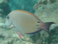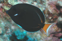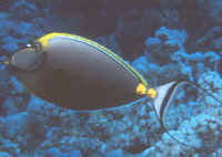 Whatever common name applied to these razor-wielding fishes, the Surgeons, Tangs or Doctorfishes span the entire bandwidth of aquarium suitability. A few ship so poorly they rarely recover from the rigors of capture and transport from the wild. Then there are the members of the family that should be disqualified on the basis of growing too large (quite a few to more than a foot and a half in length), and/or outright agonistic behavior... The majority, though tough as proverbial "nails", must still be qualified as through careful individual selection on the basis of apparent condition and proven feeding. Not to worry, here we'll sort out which are suitable for aquarium use. Classification: Taxonomy, Relation with Other Groups The surgeonfish family Acanthuridae comprises six genera and about seventy two species. Many are important food and aquarium fishes. Where would our hobby be without such favorites as the Yellow Tang and other Zebrasoma, the Yellowtail Blue Paracanthurus, various Naso and Acanthurus and lesser-known Bristlemouth (Ctenochaetus) Surgeonfishes in addition to the Prionurus? All surgeonfishes are laterally compressed covered with very small scales giving their bodies a leathery appearance. They have long continuous dorsal fins, and small terminal mouths with fine teeth. What really distinguishes the whole family though is the presence of one or more spines on the caudal peduncle (the part of the body right before the tail fin), hence their scientific name from the Greek, acanthus = "thorn". With a twist of the tail these spines are used to as a formidable weapon when needed. Modern classification schemes divide the six genera of Acanthurids into two subfamilies (names ending in "inae") and three tribes (ending in "ini"). The subfamily Nasinae, with one genus (Naso, the Unicornfishes) and seventeen species have two anal fin spines and three soft pelvic fin rays. Several have a frontal "horn" protuberance that gets larger with age. Four branchiostegal (gill supports) rays. The subfamily Acanthurinae, the rest of the surgeonfishes, bear three anal fin spines and five soft pelvic fin rays. Five branchiostegal rays. Tribe Prionurini; one genus (Prionurus), six species, rarely offered in the trade. Have 3-10 non-retractile bony plate "scalpels" on their caudal peduncles. Tribe Zebrasomini; containing the genera Paracanthurus (one species, the Yellowtail blue), and Zebrasoma of seven species. The Tribe Acanthurini, genera Acanthurus and Ctenochaetus can be discerned from each other by the six species of Bristlemouths (Ctenochaetus) peculiar long, comb-like teeth. Surgeonfishes as a family are circumtropical. They are prominent species in shallows to a few hundred feet on rocky and coral reefs worldwide. Most are found in the western Pacific, with only nine species in the Atlantic and four in the eastern Pacific. Size-wise they are from a few inches to a couple of feet in total length. Captive Suitability Scoring: After long thought, investigation of others declared opinions, and handling thousands of these fishes over the last thirty some years in the trade I've come up with the following scheme of "scores" for each on its likelihood of surviving the rigors of aquarium care. To a degree this information is necessarily historical (what has happened, may not be the general trend to come), and is subject to "improvement" on the keepers side as a consequence of providing larger, more stable quarters and more diligent husbandry. But, by and large a relative score of one (1) indicates the "highest and best" survivability under captive conditions; let's say most of the specimens of this species collected surviving more than three months. A score of two (2) is indicative of a mortality of more than fifty percent between one and three months. Lastly, and sufficient for our purposes, a three (3) is the worst score, with more than 50% of the species perishing before a months time of capture. I entreat you to leave the latter group to the sea, or at least to study and provide the best possible circumstances for these animals. I'm aware that other authors, even highly respected scientists' ratings are different than your dealer(s) and mine probably consider my "judgments" too harsh. My advice is indeed, not to rely on what's stated here and/or any one other source of information. Before purchasing these (or other livestock) do your best to gather as much pertinent "accurate, significant, and meaningful" information as you can from reading, other hobbyists and the industry. Genus Acanthurus ("Ah-Kan-Thur-Us") Species; the Good, The Bad, and The Unknown: How many surgeonfishes in the genus Acanthurus do you know? There are Powder Browns (A. nigricans (nee glaucopareius) and A. japonicus), the Powder Blue, Atlantic Blue, Achilles, Oriental... any others? Hey, no cheating by looking below. All told there are some forty described species in this genus; including two "mimics" often mistaken for dwarf angels! Some Acanthurus make hardy captive specimens, others have a dismal aquarium history; a handful are too poorly known to be judged as yet. "Good" Hawaiian Acanthurus (One's That Generally Live)(1's):