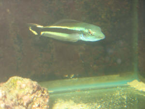 5/1/10 Re: Tilefish (Hoplolatilus) 5/2/10 Hoplolatilus chlupatyi 9/11/09 Re: Hoplolatilus chlupatyi 9/11/09 Want to share some ideas on keeping Hoplolatilus 05/19/08 Hi Crew, Greetings from Shanghai. You all have been a wonderful source of information for me over the years and, so, I wanted to repay you all a bit on my observations on keeping Hoplolatilus and why I believe that these fish should be kept in small groups of 3 to five for best results. <Ahh!> About a year ago, we purchased our first Hoplolatilus, which was a Hoplolatilus marcosi. The fish was a fat and beautiful specimen, but it died four weeks later due to starvation despite numerous ways to get it to eat. <Very, too common with Malacanthids in captivity> It was not that the tank's other inhabitants were stealing its food; the poor thing just hid under a rock and did not budge (remarkably no flying suicide attempts either). About three months ago, we saw a 4" Hoplolatilus purpureus and decided to try again. The fish was placed into our 450L quarantine tank and went straight for the bottom; digging a hole in the sand under a PVC elbow. <Typical behavior> Unlike the previous H. Marcosi, this fish was at least coming out each night when the halides went off and would swim in the powerhead current for about ten minutes, but, again, would not eat. A dear friend of mine here whom has raised these fish before said that the best way to keep them is in small schools. So we ordered two more and placed them into the quarantine tank a week later just after the halides had gone out for the night. The impact on our other H. purpureus was immediate: all three schooled up and went straight into the powerhead current. When we offered dinner an hour later, all three pigged out greedily on mysis (my guy's hunger strike was entering week three...). Three months on in our 2 meter tank, my three guys are very fat and very active. They chow down at feeding time and all three will actually greet you at the glass when you come near the tank. They also very rarely hide. To elaborate further on my theory that keeping these fish in small groups is important to their well being, I have another friend was experiencing similar hunger strike problems with his Hoplolatilus starcki. He, like us, added another brace into his tank and the impact on his not too happy fish was the same. He has since added another two fish and they seem to be in wonderful health. <Yes! Sandtilefishes are always observed in social settings in the wild> I hope that this small observation helps someone down the road somewhere with this wonderful animal. Best, Chris <Thank you for this valuable input. You have saved many incidental losses thereby. Bob Fenner> Purple Tilefish decline 5/14/07 Hi Bob, Thanks for your continued help in this "challenging" hobby. We have had this purple tilefish for about 3-4 months. It has appeared very healthy and has been an aggressive eater and is nice and plump. <Good signs> I noticed in the last two days a change in his eating pattern. a. he didn't come out right away and b. he seemed to almost not see as well... missing the large pieces he usually loves. We did a water change recently but all parameters (ammonia, nitrate, ph, phos, kH, .etc) appear optimal. Today all of a sudden he was franticly swimming and went behind the rocks where he is now breathing rapidly. Definitely showing signs of being on the way out. Any clues why this may have happened. I know this is pretty vague and these can be difficult to keep...but he was very healthy and this was very sudden. Nothing else in the tank appears to be having problems. <Mmm, could be a vitamin deficiency (I would soak or supplement the water or both... with such, including HUFAs (e.g. Selcon) and iodine/ide... You do have enough room for this Malacanthid I hope... Need very large spaces to feel comfortable (hundreds of gallons) and deep, soft sand substrate to duck into... The best arrangement for food, mediating environmental changes is the use of a large live sump (refugium) with a DSB, macroalgae... Bob Fenner>