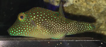 Toby puffer identification 9/25/05 Hello Bob, <Emily> I was on your site and read your notes on the difference between the Toby and the filefish. I can't really tell from the pictures which is a puffer and which is not. I have recently bought a Toby puffer( valentini I think) and just wanted to verify that I got a puffer instead of a filefish. Can you give me more prominent signs to look for in order to tell a puffer from a file fish? <Mmm, the very best is their dorsal fins... though not often erected, will likely be when excited (like when feeding). The Filefish has a prominent anterior spine (first dorsal ray), whereas the puffer has all-about the same appearing rays> My fish doesn't seem to have the obvious blue lines running from the head to tail but there is a hidden blue/green color at the back if seen at a special angle. <Mmm, the color difference/s are not consistent, nor telling> Appreciate if you could help me identify my fish. Thanks, Emily <Look on fishbase.org, the Net... at both species... and their dorsals. Bob Fenner> False eye puffer I read on the wet web about puffers but I didn't see information on this one. I have a 46gal. aquarium with two Percula clowns and a yellow tang so far. would it be okay to have the false eye puffer. I read about him on another site and it looks like it would be. I looked under compatibility but it just says puffers not specific one. Thanks, <This is a new common name (for me...). If a Toby/Sharpnose Puffer (subfamily Canthigastrinae) might be nippy toward your Clowns... Other species get real big... so do try to find which species this is... maybe take a long look on www.fishbase.org under the puffer family names Tetraodontidae, Diodontidae. Good luck. Bob Fenner> Some Puffer Questions . . . Dear Mr. Fenner, I wrote to you a few days ago about "False Eye" puffers. After closer examination of Fishbase.org (great site, by the way, thank you for the link), I am sure that my puffer is a Canthigaster solandri. <Ah, good> If you don't mind, can you tell me if this species has ever bred in captivity? <Not as far as I'm aware> What is the normal lifespan of a sharp-nosed puffer? <A few to several years, depending on care> Do they do better in pairs or as single specimens? <Almost always singly... though often found in pairs in the wild. Please see my "Puffer" group coverage on our website: www.WetWebMedia.com for pix and more information on Tobies... including the FAQs there... and the lead to other articles.> What would be the minimum tank size you would recommend for a pair? <Sixty gallons> I am sorry I have so many questions, but I can't seem to find anyone that seems to have any experience with this species. Also, you wouldn't happen to know any importers that sometimes get C. pygmaeus, would you? <A very nice fish... only see it occasionally... You could put in a special request... with the specialty e-tailers of such livestock... like Marine Center... link on the WWM site> Thank you so much for your help, Stella <You're welcome. Bob Fenner> Comment on recent FAQ (False Eye Puffer, Toby) Recently, someone e-mailed you asking about a "False eye puffer" and you said you weren't familiar with that common name. There are three species sold as the "False eye puffer": C. solandri, C. janthinoptera, and C. margaritatus. I can't tell the difference between solandri and margaritatus; do you know if they are the same thing? <Ahh, thank you for this. These are all distinct species... You can see them on the www.WetWebMedia.com site as well as www.fishbase.org (under their genus Canthigaster, or the Family Tetraodontidae listing... You will also find a huge offering of common names on Fish Base, but on entering the "False Eye Puffer" I got "no response"...> I currently have a 3.5" specimen that is one of the above. He is getting along fine with two clowns, an algae blenny, and a 1" valentini puffer. <Ahh, good. The Tobies, aka Sharpnose Puffers are amongst my favorite fishes... nippy to a fault at times, places, but hardy, intelligent, even comical animals for our interest. Bob Fenner> Sharpnose puffer Dear WetWebMedia Crew, <Hi! Ananda here answering the puffer question....> I recently started a marine tank (due mainly to my affection for clownfish), <Wonderful little fish> and it has been going very well, but one unexpected result of this venture has been that a couple of my friends have decided that they, too, wish to join the ranks of the marine aquarists. <It's a contagious hobby!> They showed me their tank a little while ago, and although they are very well-meaning, they didn't realize they should take the time to do some research before going out and purchasing a whole lot of fish. <Whoops!> In a 50 gallon fish-only tank (meaning no live rock, although there is plenty of cover in the form of lace rock) <Which may eventually become live, should they add some live rock to the tank -- definitely a recommended course of action. On the other hand, there is no guarantee that the lace rock is free from undesirable minerals.> they now have three damsels (a domino, a blue one with a yellow tail, and a tiny 1" yellow guy with ~3 horizontal dark stripes--forgive my not knowing their names!), <Scott Michael has a wonderful book called "Marine Fishes: 500 Essential-to-Know Aquarium Species" -- I've heard it called "the picture book" in more than one fish store!> a nasty magenta Dottyback (who is sullen but not savage, according to my friends), an unidentified little brown goby and a Sharpnose puffer. The puffer is what I am curious about. He was only purchased a few days ago, and apparently sold only under the label of "Sharpnose puffer," so I don't even know what kind he is. I looked through some of your pictures, and I think perhaps he's a C. smithae, but that's only a guess. <Could be Canthigaster rostrata...another place to look is http://www.fishbase.org> He is a very charming fellow, but neither my friends nor I know anything about puffers, and they're r