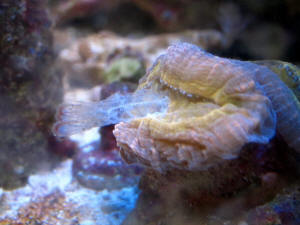 Re: Trachyphyllia.. nutrition, health... RMF career 7/22/05 Good day Bob or whoever I may be speaking to today....I hope all is going great today... I have several things to throw your way today...I'm sorry if I've got a repeat question thrown in here. In regards to my Trachyphyllia: When food is offered to it, the mouths close up. Except when I offered plankton. I haven't ever seen sweeper tentacles come out (even when it was doing normal cycles), Do you think it may be getting the nutrients it needs by me taking a plastic syringe and gently directing fine meaty foods at it... even without the presence of the tentacles? <Possibly, yes> The algae that is forming on small parts of the skeleton... could I try to gently remove it somehow or would this be advised against? <Directing a stream of water... as with a powerhead or small submersible pump is all I would do... don't physically touch> Is Iodide harmful to any marine animals or corals if used properly (that you are aware of)? <Not unless overdosed> I've got a rock that had several mushroom corals growing, a piece of the rock broke off leaving one of the mushrooms attached to the original rock as well as the broken off piece. Is it best to let it be (it is hanging, I've propped it back up but it wont stay) or someone recommended I should just tear it off the original rock :( sounds painful but I'm not sure it feels pain like that? :) <I would "tear it off", move it to someplace safe, stable> Thank you in helping me on my journey, I swear I'm not trying to be hand fed... I just need a little help with this predicament (the brain). And the other questions are just thrown in there... my main concern is my brain though! On a bit of a more social level...what is your favorite dive location? <Mmm, there's a bunch... overall, the Red Sea likely> Bob... do you go and speak at seminars <Almost every month... for the last few decades... to hobby groups mainly, in the pet-fish and dive/adventure interests> or am I interpreting some info wrong.... at one point in one of your responses to someone's questions it sounded like you do seminars, if you do...have you ever found yourself in Indiana? <I think so...> One more personal/social question... what is your career... How do you make it possible to go on all these wonderful diving journeys? Thanks guys!!! Codie S. <Good, friendly questions... I do five "things" for money, including two that are petfish related... am a content provider, selling writing and photography... But really, am retired in terms of having to "do" work... invested a part of what I earned, in stocks in good companies, real property... so I can/do travel about half the year. And I do encourage you to take up the dive, travel habit as well! Thank you for asking, sharing. Bob Fenner> Coral questions Hi, <Graham at your service.> I have a couple questions and can't find the answers in your FAQs. The first one: I have read about open brains and different scientific names. I have a Wellsophyllia; is this an open brain? <Yes. Most likely your brain coral is in the genus Trachyphyllia.> Also, does my Wellsophyllia need to be fed, and if so what? <The Brain coral will benefit from regular feedings, however, it's not needed. If you wish to feed your coral, you can try to feed the coral at night when its feeder tentacles are out. Once these tentacles are out, you can place several small pieces of krill within these tentacles and the brain should consume the food. Silversides and lancefish may also work.> Another quick question. What do you recommend to feed Fungia and what do you find to be the best method. <If you feed your fish regularly, most likely the plate will be catching food particles. You can also place small pieces of meaty foods (krill, silversides, squid, etc.) within the plates tentacles. The tentacles should then push the food towards the central mouth where the food is then consumed.> Do frogspawn need to be fed as well or is good lighting sufficient (I have 1 250 watt metal halide and two 36 watt actinic bulbs in a 75 gallon corner tank). <As I stated above, they will benefit from regular feedings, although it isn't necessary. If you choose to feed the coral, do so the same as you would as I described above with the plate coral.> Thanks!! <Take Care, Graham!> Andrew Coralline Algae Growth Hello Crew! <Hello, Ryan with you today> Just can't seem to find the answer to these in the FAQ's (sometimes TOO MUCH good information to find a specific question). <I know! It's a bit overwhelming at times> 1. I have an open brain coral that I feed meaty treats (shrimp, clam, squid) 3 times per week. I noticed that it has 3 mouth-like structures that I put the food directly into and it gets sucked in. I have to stand guard else my ever hungry clowns will snatch the food up. Is it necessary to feed each mouth? Can I just feed one or two of them and the nutrients will get shared to the entire organism? The third is a little hard to see/reach and this direct feeding method is the only way I have found to feed it without others in the tank (clowns, shrimp) snatching the food for themselves. <The more each mouth eats, the better the entire colony will grow. Corals grow in a very deliberate way; To make the most of a certain environment. This said, I would either move the brain so that you can feed the entire thing, or make the extra effort. As for snatching, it's highly frustrating. Will a fish feeding just before will keep them distracted long enough?> 2. On my live rock, I have tons of coralline algae growing. Colors of purple, maroon, red, green and pink. On my glass, pumps and base rock (Tufa), I only have one shade of purple growing. I would really like a mix of colors. Any ideas on how to encourage this process or why only one is spreading from the live rock to other areas? <One is outperforming the others at this given time. What's your calcium level? Some varieties of coralline won't grow unless high calcium levels are met. It's just 