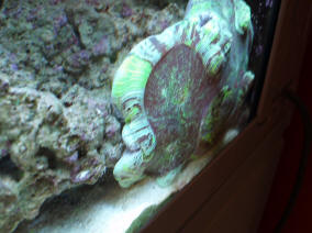 <wow... this brain is bleached (as in, "has expelled a lot of its resident and necessary zooxanthellae). They bleach for many reasons. Temperature shock, excessive light, etc. Has it been fed very fine meaty foods (not chunks which get regurgitated at night) weekly at least of not daily? This is a very hungry coral that needs regular feedings...perhaps the reason for the state of duress if not. As far as your question is concerned... yes, excessive phosphates can be quite harmful to coral such as this by interrupting calcification... but would not cause the color change necessarily> Is there something I can do for that brain coral? <if the lights are not too bright, it simply needs regular foods and many months to recover> I did have a chance to read the mud FAQs (some really good discussions!). What would be your favorite hang-on skimmer for this type of application? <I don't personally rate many hang-on skimmers very highly, but have heard excellent feedback from aquarists about Aqua C models> Thank you very much for your help. jS. <best regards, Anthony> Re: Ecosystem 40m filter and water quality (Note: Add image) Dr. Fenner, <Just Bob please> Thanks for the reply. Yeah, the phosphates were 3.0 PPM. I bought some of that filter pad with phosphate removing resins and put them in after the mud chamber and now I test @ about 1.0 PPM. Still way too high, but decreasing. <Yes> I have always fed the tank sparingly, once a day, with Nutrafin Marine Complete. also 5 ml. of phytoplankton weekly. We have nearly perfect 17.8 M? <Is this a measure of conductivity, like micro-Siemens?> de-ionized water, at the plant, that I use for top off and changes. I think you are probably right about too much nutrient. I do have some green algae growth in the sand, during the tank's lit period but gets removed in the nighttime. The Smartlight's lamp is only 3mo. old. Attached is a picture of the brain and some of the visible green algae. Does it look like excessive nutrients? <Don't see the pix, attachment> Is there something I can do for that brain coral? <You are doing it> I did have a chance to read the mud FAQs (some really good discussions!). What would be your favorite hang-on skimmer for this type of application? <This is posted on the WetWebMedia.com site under "Skimmer Selection"> Thank you very much for your help. jS. <You are welcome. Bob Fenner><Ah, did see it. Yes to the green algae growing apparently on its margins. Nutrient, health-related. Reduce the "fertilizer" and all should clear up over time. Bob Fenner> Trachyphyllia Dear all, I am thinking of purchasing a Trachyphyllia brain coral in the new year. I will have installed a calcium reactor by this point to make sure alkalinity and calcium are at decent levels. I have a few concerns about this coral that you may be able to answer. My stock is the following: 2 Trumpet corals 1 Favia 1 Euphyllia Various leathers yellow polyps green star polyps Mushrooms 1 colony of pulsing xenia My lighting is 3 marine arcadia whites (9000K) and 1 actinic blue. All with reflectors. Water quality is up to snuff, with regular skimming, carbon use and Rowaphos. Can you tell me if the lighting is ok, and give me an idea on this corals placement in the aquarium. My LFS says to place it on the bottom with very low to no flow. Also how often do I need to feed it? I feed currently with red plankton, shredded mussel, and Mysis shrimp to all my stonies. Your comments are appreciated. <The care for Trachyphyllia is going to be similar to your other stony corals. If these are doing well for you, the Open Brain likely will too. Please do place this coral on the sand. Your LFS is absolutely right about this. I would go as far to say to not purchase one that you see sitting upon rock. -Steven Pro> Open brain coral that will not open... HI- I have a 72 gallon reef/fish aquarium with several healthy corals and fish. To name a few I have tangs, gobies, chromes, a pair of clowns, an anemone, finger leather, flame mushrooms, star polyps, yellow leather, etc. All are healthy and doing well. My nitrate and ammonia levels are good, the temp is 78, the salinity is 23....I have live rock, live sand, and a good sump and separate 55 gallon refugium. My concern is my open brain that I added bout 10 days ago- it was open and healthy in the store but will not open in my tank. I have tried moving it, feeding it directly, etc with no success. Any ideas?? <water flow that is too strong or rather simply directed upon it in laminar (one directional fashion is very irritating). Else a simple acclimation to new lighting. This is a sand dwelling creature... and I assume that you have placed it on the sand bottom. If it is on rock, it will likely die from an infection due to abraded tissue from unnatural polyps cycles in contact with hard live rock. Must be kept on sand. Best regards, Anthony> Open brain coral that will not open... Hmmm- ok- it was in the sand but when bought it from the store it was on rock - I had moved it to a rock in the tank but I will try moving it to a sand spot with less current- how long does it usually takes to adjust? <that depends on if damage was done by the LFS keeping it on the sand or not. Since you have this animal appropriately on the sand already... Please do not move it (moving new/stressed coral often kills them when they could otherwise adapt) unless you must. Really... unless you have a powerhead blasting right at it, I'd advise you to leave it be. It may take a couple weeks to adapt. Do feed as soon as possible. Juice in the tank first (small amount to coax feeding tentacles to come out as if it were nighttime) and then 15-20 minutes later finely minced food. Best regards, Anthony> |