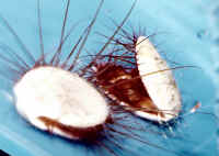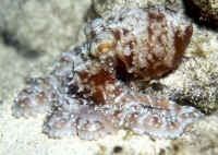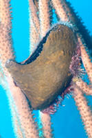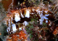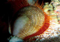 Bivalve Mollusks: Shellfish with two opposing shells that are hinged at one end with an elastic byssal material and brought together with attached muscles. May be attached to hard substrates, burrowed into same or wood, buried in sand, mud or free-living, able to jettison about with powerful discharges of water from their exhalant siphons. Most bivalves are filter-feeders, sifting food through their gills, which also function as respiratory organs. Some notable aquarium species, the giant clams (family Tridacnidae) utilize endosymbiotic algae (zooxanthellae) to produce food through exposing their mantles to bright light. Flame Scallops that are not. Pen Shells, family Limidae: A popular item, particularly Lima scabra out of the Caribbean. Most all of these die in short order from starvation. Need frequent "immersion type" feedings... daily.