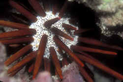 Sea urchins Book 6/18/08 Hello Bob, My name is Henk van Noordenburg and live in the Netherlands. Since 1989 I am studying and collecting recent echinoids. The Philippine sea urchins are my speciality. Together with Simon Coppard of the British National History Museum of London, I described a new species from the Philippine region last year . Some weeks ago a new species from Palawan Island was described and named after me. I am the author of the book: "Sea Urchins of the Philippines, Part I, the Irregulars". It is the first part in a series of three. In this book 69 species of irregular recent species that occur in the Philippine waters are described and photographed in detail. The book is recommended by scientists like Dr. Christian Neumann Museum fuer Naturkunde Humboldt-Universitaet in Berlin and Dr. Andreas KrohNatural History Museum ViennaThe book is published by "Artificial Harmonics" in the Netherlands and costs 49,95 Euro ( VAT included). More information can be found on www.artificialharmonics.nl If, for some reason, you cannot open the link, or you have not received a reaction after ordering within two days, just let me know and I will send you the necessary information. Echinologically yours, Henk van Noordenburg <Will post/share Henk. Bob Fenner> Urchin Hitchhiker: Pencil Urchin - 1/31/08 Hello Crew! <Hi Andy!> About 4 weeks ago, I purchased a large piece of cured Fiji rock to round out my LR aquascape. It is a neat piece, with a big, winding hole running the length of the piece. Even though my LFS claims that the water in the LR tanks are not mixed with other water, I have seen fish in the tanks from time to time, so I placed the LR in my 30 gallon QT for 2 weeks just to be on the safe side. During QT, I can't say that I stared at the LR much other than when checking water parameters, etc. After the QT period, I placed the LR in my tank. About 2 days later, I was shining a flashlight into my tank to check out the nighttime goings on. When I shined the light in the hole of the new piece of LR, I noticed an urchin that is about 2" in diameter (body) (thankfully, the lack of acclimation--twice--didn't kill it!). From browsing WWM, I can confidently tell you that it's some type of pencil urchin, either a Eucidaris tribuloides or a Heterocentrotus mamillatus (my guess, since the LR is pacific, but it has characteristics of the former). <Okay> It is very elusive, so I haven't been able to get a picture of it (or even a good look at it). In fact, for about a week (and apparently, the entire time it was in QT) it didn't move from the cave. Since then, it has made an appearance outside the cave, but only briefly and then on the underside of this same piece of LR. It has now moved back into the cave (who knows where it goes at night). <It goes out to eat! These urchins are nocturnal foragers that, once they've found a nice little protected spot, tend to use it as their "home base". They wedge themselves into place during the day with the help of their thick spines.> My research leads me to believe that it likely poses little risk to its other tank mates--a Sailfin tang, a Gold Stripe Maroon Clown, a Brown Combtooth Blenny, a Royal Gramma, a Copperband Butterfly, 2 cleaner shrimps, 15 or so mushrooms, some type of tree coral (I keep meaning to send in a pic for an ID), a Lemnalia tree coral, two small colonies of pulsing Xenia, and a Trachyphyllia geoffroyi. My tank is 110 gallons, with about 90 lbs of LR, under-the-cabinet trickle filter (in which I run activated carbon that I change out every 2 weeks), a 30 gallon fuge (LR, a huge tuft of Chaeto, and 5" DSB (with about 1 billion bristle/fire worms) on a reverse daylight cycle), and a Coral Life Super Skimmer. My water parameters are: ammonia, nitrite, nitrate and phosphate all 0, temp 80*F, Alk is 3.5 meq/L, pH is 8.3, calcium is 400, and spg is 1.026 (I have a Salifert I2 test kit and a SeaChem iodine test kit, both of which show no appreciable levels, even after dosing with Kent Iodine over a period of days--I've since stopped adding Iodine until I can figure this out). <Good thinking. Please read over the FAQ's here at WWM, starting here: http://www.wetwebmedia.com/iodfaqs.htm > I use RO/DI water (mixed/circulated days in advance of water changes). <Excellent> I dose, as needed, with ESV B-Ionic 2-part buffer. Probably more than you need to know, but . . . <Hey, it's better to have too much information in these queries than too little!> So, to my questions . . . I'm a little worried about this guy starving, because he doesn't seem to move around much and there's not much on the new piece of LR to feast on. <Hmmmm, well he's undoubtedly moving about at night to feed. That's typical for these urchins. What we don't know is which species it is. Some are mostly herbivorous, while others dine on corals, sponges, tunicates, bryozoans, snails, etc. Some even employ those spines to trap/kill fish, shrimp, and other organisms.> I have tons of coralline algae (too much), but the urchin doesn't seem interested in finding it. An attempt to plant Nori would meet with immediate failure, as the Sailfin Tang and Blenny would make quick work of it. <Well, the good news is that these fish aren't nocturnal. I'd rubberband some Nori, or a seaweed sheet, to a rock and place it near the cave after the lights go out.> I have shrimp pellets that I use to feed my fuge--should I try dropping some of those in the display at night? <You could certainly give this, or a bit of clam/squid/etc a try. It's going to be tough though, to keep the shrimp and/or any other nighttime critters from running off with it. To get around this, try to put the food as close to the urchin as you can, and give the shrimp their own little bits to distract them. Is it normal for these urchins to remain fairly stationary? <During the day, yes, very normal.> I would think not. Also, am I correct that the urchin poses little risk to my sessile inverts? <Again, depends on the species/i