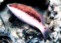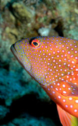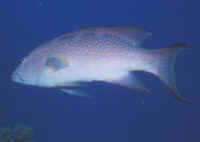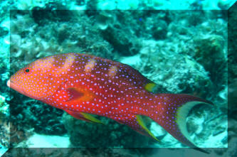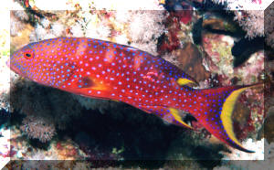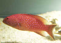 Every individual Variola I've seen in the trade has been between four and eight inches. The smaller, the better in terms of settling in. These fish and all other basses should be moved as few times as possible; adaptability reduces with growing size and captive moves. Environmental: Conditions Habitat: Lyretails spend most of their time looking in and amongst breaks in their reef. Provide yours with plenty of caves and other dark spots for cover. Chemical/Physical As far as captive marines go most basses are very tolerant of minimally "poor water quality". Any stable tropical temperature will do. A note here regarding specific gravity and much of the livestock coming to us from the Red Sea, and to a lesser extent the Indian Ocean. Many aquarists maintain their systems at an artificially low specific gravity (1.018-1.023); to increase carrying capacity, lower parasite loads, save on salt mix... Fishes by and large do fine with lower spg from the Red Sea; though the normal density of water is higher (there is some 1,600, not a typo, inches of evaporation in the upper gulf annually). For invertebrates from the area a higher, constant spg of 1.025-1.027 is appreciated. You will be rewarded with much more colorful, vigorous and long-lived aquatic charges as a consequence. Filtration Must be adequate and rigorous to handle large tanks and occasional large wastes. Behavior: Territoriality These fishes are best kept one to a tank; unless the system is very large (hundreds of gallons), and well-appointed with rock and coral. Introduction/Acclimation This bass will probably settle in as the de facto alpha animal, though you will have to watch closely to appreciate its position. Charging and wide-mouthing would be challengers generally passes without serious incident. Predator/Prey Relations Though most basses as species and individuals are not overtly "mean", they are predaceous carnivores that will swallow any tankmate smaller than their capacious jaws. Feeding/Foods/Nutrition: Types, Frequency, Amount, Wastes Like other larger basses/groupers, the lyretail soon learns to recognize intended food items and your association with them. They will accept live freshwater organisms as well as formulated, preserved-frozen foods. Unless you want to have your bass outgrow and pollute its system in short order, feed sparingly and infrequently, two or three times a week, unless it is a smallish specimen (only a few inches in length) and/or you keep your system on the warm side. Disease: Infectious, Parasitic, Nutritional, Genetic, Social Unlike some its smaller brethren, Lyretails are relatively disease resistant and hardy. Summary: What more could you ask for in a fish-only centerpiece addition to your system? The Lyretail Grouper is one of the most attractive fishes coming from a sea of over-abundant color. We can all look forward to more and less-expensive quality livestock from the Red Sea as a consequence of improved international relations in the area, and the forethought and entrepreneurial spirit of new collectors there. Bibliography/Further Reading: Special thanks to Scott Michael for pointing out errors in my original draft, and suggesting useful corrections. Campbell, Douglas G. 1979. Marines: their care and keeping, Groupers and their allies. Parts 1-3. 9-11/79 FAMA. Fenner, Robert. 1996. The Lyretail Grouper, Variola louti. SeaScope v.13, Summer 1996. Goldstein, Robert. 1992. Spectacular serranids, the colorful and fascinating groupers. AFM 11/92 Hunziker, Ray. 1988. Orange lightning- experiences with Cephalopholis miniatus. TFH 3/88. Michael, Scott W. Fishes for the marine aquarium; basses and grammas- you can't go wrong with these. AFM 8/95. Nelson, Joseph S. Fishes of the World. Wiley. 3rd Ed. 1994. Thresher, R.E. 1984. Reproduction in reef fishes; part 2, seabasses (Serranidae: Serraninae) TFH 11/84.