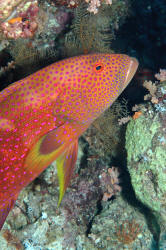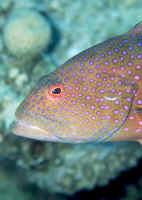 Size: Some groupers grow to over 3 meters and 400 kilograms. Many Tukas, subfamily Anthiinae, are only a few inches and ounces. Our Variola Lyretail Grouper gets to thirty inches and eight kilos in the wild. Selection: I have never seen a "bunk" specimen of this species offered for sale; all have been excellent. For basses the lyretail is outgoing, quickly adapting to new surroundings and spending a good part of the time out from cover. Juvenile coloration is especially variable; at four to six inches have a broad black horizontal mid-body band, red to yellowish above, whitish underneath. Mid-size fish are so purple it almost hurts your eyes, with bright blue spots overall. As they age/grow adults become more salmon to light with enlarged, lighter blue spotting. Be aware that the more common Miniata Grouper or Hind, Cephalopholis miniata is sometimes offered as the Lyretail. This is a gorgeous, desirable species in it's own right; and similarly colored/marked. The two can be easily told apart by the shape of the tail fin. The lyre's is strongly lunate, that of the Miniata is square to slightly rounded.