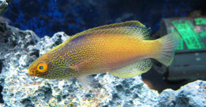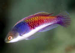 get along. Bob Fenner> Fairy Wrasses 12/2/04 Hi! I currently have a 180g setup with nine fish in it. Among those fish are 4 Fairy Wrasses- C. luteovittatus, C. cyanopleura, C. lubbocki, and C. lineatus- all are males. My question is, can a female lineatus be added safely or will she be harassed to death by the other fairy wrasses? The local LFS has a female in stock and she'd be the smallest of the wrasses in the tank. Your help is greatly appreciated! Scott <Although Fairy wrasses are relatively mild mannered (especially for wrasses!), I am surprised that those that you already have are tolerating each other. Many fairy wrasses do live as pairs or harems, so the M and F lineatus should be OK, but the other males may harass her or become increasingly aggressive due to the presence of a female. If you do attempt to add this fish, first and foremost, quarantine! Then, be prepared to remove the other males in decreasing order of aggression if necessary. It is strictly a matter of taste, but if I were in your position I would be willing to give up all of the other males to keep the M-F pair. Best Regards. AdamC.> Re: Fairy Wrasses 12/9/04 Thanks for getting back so quickly! <Glad to!> I too am surprised that they all get along as well as they do. There is so little aggression it's almost scary. Since the addition of the lineatus there has been even less than before. It is pretty cool, though, how they interact; i.e. color changing and flashing as warnings. <Seeing really natural behavior is amazing!> Just out of curiosity, why choose the m/f lineatus over a diverse group of fairy wrasses? Thanks again! Scott <Just a personal interest in observing courting and knowing that fish must be in exemplary health to breed. Best Regards. Adam> Breeding Cirrhilabrus? 10/9/04 I'm trying to breed Cirrhilabrus wrasses, (Cirrhilabrus temminckii) and (Cirrhilabrus flavidorsalis?). Do you guys have any pointers or info? Philip, S. El Monte <hmmm... I am not aware of any significant hobby or commercial breeding/culture activity with this group of fishes. Do check into the database at the Breeder's Registry online... and perhaps the old TFH "Reproduction of Reef Fishes" for field observations that might give you insight to go on. From what we know, you will need very large and tall aquaria to begin to have any chance at successful pairings for their elaborate and extended mating "dances". Also, do think about visiting or chatting with the folks at some public aquaria like Atlantic in Riverhead NY where spawnings (no attempt at rearing) is an almost daily occurrence. Best regards, Anthony> Breeding Cirrhilabrus II 10/11/04 Do you have a link to the website of the Atlantic public aquarium in Riverhead NY? <if you are going to succeed... you need to be more resourceful than that <G>: simply do a keyword search with the info given to you: "Atlantis Aquarium" "Riverhead, NY", etc... it will show up on the first google page of hits. Do help yourself, bub> I would be totally interested if the fish are spawning like crazy. <I have watched them spawn... and my NY friends say this is a regular occurrence in the evenings> By tall aquaria, how tall are we talking about? <several meters - pool sized: much bigger than home aquaria, as they need a deep column of water to run to the surface for their mating rituals... like Centropyge angels> I've already got four C. temminckii in quarantine, but I don't know if they're still in the female phase about to transition to being males or if they're immature males in development. <sex change can occur completely in as little as 10-14 day> So far the pics on the internet I've seen are probably of dominant(?) and subordinate males(?), (based on the elongated pelvic fins), but no females(?). They are anywhere from 1 3/4" to 2" in length. The pelvic fins on all of them are not elongated yet. By the way thanks for the leads. Philip <very best of luck! Anthony> Unidentified Cirrhilabrus I don't know what this wrasse is, but I've kept one before. It is one of the larger ones, growing to be roughly 5 inches in length. The base color of this fish is a drab olive green. There is a black bar running horizontally across the length of the body that's on top of an orange horizontal bar. The pelvic fins are elongate and pointed. It's belly is a light powder blue, and has a dull red streak across it's eyes. However, the feature that stands out the most despite it's drab coloration is its remarkable super bright metallic blue caudal fin, with flecks of gold. I have seen it only one other time previous to today. I suspect it may be a male Katherine's Fairy Wrasse, (Cirrhilabrus katherinae), or an Orange Bar Fairy Wrasse, (Cirrhilabrus earlei). So far on the net, I haven't seen a picture of Cirrhilabrus earlei so I wouldn't know for sure. Is this description adequate for identification? Philip S. El Monte <Not for me... please see WWM here: http://www.wetwebmedia.com/marine/fishes/wrasses/cirrhilabrus/index.htm or Fishbase.org under the genus, or Scott Michael's Reef Fishes, v.1, Or Rudie Kuiter's latest on Velvet, Fairy Wrasses by TMC. It may be that you have an as-yet unidentified Cirrhilabrus (there are several on the market). Bob Fenner> Cirrhilabrus <MikeD here> This may be an odd question to ask, but what is the normal color of a fairy wrasse's droppings? I had Cirrhilabrus wrasses of several kinds before, and have noticed some have white droppings. Of course other times, they seem normal, and are an olive green coloration. What causes them to have white droppings?<The normal explanation is that it depends upon the diet, just as with any other animal, with whatever goes in determining whatever comes out....sort of like corn in humans> While I'm quarantining this species of fish, if I had to treat for external parasites, how do I do so without killing them? Apparently, freshwater baths are out of the question for this fish.<My suggestion would be a formalin type medication if possible, and as wit