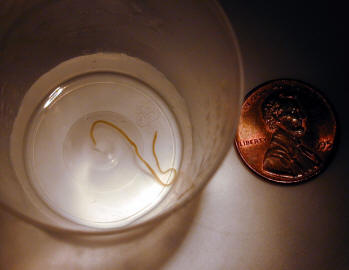 Parasite, no usable information 10/24/06 I noticed today a worm looking parasite on the front glass of our tank at work. It has been there all day in the same spot. It's white and is about 2 inches long and 1/8 inch wide with its body folded perfectly back and forth like a paper fan. Does this sound like anything you've heard of before? Thanks for your help, Nancy <Need for information. Fresh water, salt water? Check out the articles on WetWeb for a possible picture.> <Chris> Worm Identification - 10/18/06 Hi all! <Hi Don,