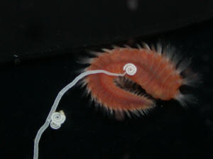 Re: Medusa/Spaghetti ID - 12/06/06 Thanks so much for the ID. <<Quite welcome>> I had the strangest thing happen today. I came home to spider webs (like things) all over my reef tonight! Do you have any ideas about that? <<I do...these are likely the feeding filaments of Polychaete worms...probably from the family Terebellidae, like the Medusa worm you found. I did my usual Monday night water change. Nothing else new thanks again for the ID. Cathy <<Mmm, try having a peek with a flashlight after dark...many new wonders to discover... Eric Russell>> What's that in your tank? A worm! 11/23/06 I recently noticed possibly a worm critter in my salt water tank. This surprise was seen coming out of a hole in the rock. It was hanging out about 1", trying to pick up a piece of raw shrimp. It looked like a worm, with Black Bands going around it. The end of it looked like a miniature Featherduster. As it was trying to pick up the shrimp it was acting as it were sucking on it while trying to pick it up . What sort of creature have I inherited? Thanks, Revs <Hi Revs, Mich here. Sounds like you inherited a Sipunculid or a peanut worm. Think of it as part of the clean up crew. Sipunculid worms are beneficial detritus feeder. Hopefully it will establish it's species in your tank.> Electric worm in my reef tank! Now on a fateful cruise 11/22/06 My wife accidentally stumbled across this article on your website. Fifteen years ago we had searched everywhere for information about glowing blue saltwater worms. <Neat> At that time we had been stranded in the gulf three miles north of Marathon in the Florida Keys. Our boat propeller bushing had failed as we were returning just before dark from a snorkeling trip. We switched to our small kicker motor to continue on. <Thank goodness you had the kicker> As darkness fell a violent thunderstorm moved over us with heavy rain, lightning and high waves swamped our small kicker motor. We dropped anchor and waited for the storm to pass. <Smart... and called on the radio...> After the violent storm the sky and sea were pitch black. The water was like glass but dozens of strange bright blue lights began to appear in the water within a hundred feet around our boat. I called my family up on deck to see this amazing sight. My youngest son said "Maybe this is what you see right after you die." <Cheerful> One of the lights was near the stern and I shined my spotlight on it. It was a worm about two inches long that glowed a brilliant blue from end to end. The water appeared to fizz with tiny bubbles around its' body and the worm looked like it was spinning at a high rate of speed. <Another good clue> After about ten minutes they all switched off at once and were gone. After a great deal of library searching and talking to other sailors in the area, only one had ever seen them before. The article on your website is the first we've seen that sounds anything like what we saw in the ocean. <Yep... some species of Polychaete... likely an "epitoke"... reproductive unit/segment... clued by the tides, moon... possibly the storm... to surface, kick out the jams so to speak... Look up epitoke on your computer. Bob Fenner>