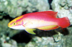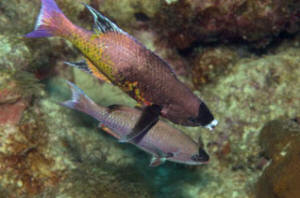 4 striped wrasse cocoon, Cleaner wrasse in nocturnal "cocoon" - 7/23/07 <<interesting... don't know that I've ever heard of a Cleaner Wrasse (likely a Labroides) exuding a sleeping cocoon, though many wrasses and Parrotfishes do... And there are a bunch of organisms that might use such feeding techniques that might render your observation... And it does sound like there is a "mystery" culprit in your tank... but who? A sea cucumber? Large Polychaete worm? Bob Fenner>> i was rearranging the rockwork in the morning right after I turned the light on in my refugium... the blue 4 stripped wrasse wasn't out yet, but when I moved one of the rock he came bolting out of what was a mucus cocoon, usually I find him sleeping in the smallest crevices of the LR but I've never seen anything like this... just thought id confirm that Larabicus quadrilineatus can and do sleep in mucus cocoons. though I don't think they 'prefer') as I've been moving his 'sleeping' spot everyday for 2-4 days now (he got moved to sump after eating SPS)..bastard...anyway...good day. -Devon sorry no spell check or punctuation. <Thank you for this input. Bob Fenner> Stocking Help Part II 3/14/07 Thanks for your input Chris. <Sure.> I appreciate it. You mentioned that one of the fish I want (Possum Wrasse) is your favorite. Do you find that your possum wrasse hides most of the time or a good amount of the time? <No, although they stick close to the rock and can be hard to see at times, but they were not particularly secretive.> I can only put so many fish in a 53g, so I don't want to put fish in there that may be shy and hide all the time. Just something someone mentioned to me about what they were told about Possum Wrasses. <They are a fairly active fish, although they do not spend much time out in the open.> Thanks Chris! Pam <Chris> Temminckii wrasse (cant find) Wrasse in Hiding? 2/9/07 To Whom this may concern, <Hi there Shawn, Mich with you today.> I bought a pair of temminckii fairy wrasse last <F>Friday (male - female). The male had some dark black spots on his sides I would have to say I think that it's do <due> to stress? <Mmm, maybe, maybe not.> I accumulated <acclimated> the fish for several hours before I placed them in the tank they also had a dip before entering the tank. <Mmm, no QT?> After the fish entered the tank the male went right under some live rock and stayed they for 3 days. He wouldn't move much only in circles to see what was going on the only way I could tell he was alive was that his eyes where <were> moving. So the problem I have is that I have a sea hair <hare> and the other day he decided he wanted to go in the area that the male wrasse was in. As the sea hair <hare> began to burry <bury> himself in that area you could see the wrasse wedged in between the hair <hare> and the live rock. The next day the hair <hare> began to rise (I wasn't there to witness this) and since I can't find the wrasse anywhere. I lifted the rock where all of this took place and nothing !!!!!! I can't seem to find this guy anywhere and the female wrasse has been doing great this whole time. <OK.> As for my tank its 140 gal with 4 large polyp stony corals as for the fish I have 3 tangs: a Naso, a chocolate, and yellow eyed tang and inverts include 3 cleaner shrimp and one coral bandit <Banded> water condition ph 8.4 salinity is 1.023 cal is 400 alk is 10 <W>what to do is he buried or dead. Or coral bandit <Banded> food. <Hopefully he's hiding. Not uncommon with this family. How are your ammonia, nitrite, nitrate levels? Any peaks? This could be an indication of a poor outcome for your fish. Not a lot you can do, but monitor your parameters and wait and see.> Thanks <You're welcome. -Mich> Shawn Smith <Please use your spell checker and grammar checker next time you submit a query.> Silly Sixline Wrasse Behavior! 1/3/07 Hi... we've have had our Sixline Wrasse for about a year now, we've never had a problem with it before. We're not sure if it's a male or female. We have a 30 gallon bio cube with a decent size piece of live rock, a Spotted Puffer, a "Nemo", a couple Sally Lightfoot crabs, Sun Polyps, which have spread beautifully onto the live rock, a Condylactis, some Zebra Hermits, and a Mandarin Goby. We were told everything would be ok together and they have been great, but all of a sudden this evening our wrasse has been coming to the front of the tank flipping on it's sides and putting it's spikes up (constantly). We've never seen him do this before. The water is perfect..... ammonia, ph, nitrate, nitrite, all levels of everything are on the dot. Salinity is great, and temp. is great. Should we be concerned with the wrasse's behavior? Thanks a lot; Jess <Well, Jess- I think it's great that you are a careful observer of the activity in your tank. This way, you are immediately aware when something seems out of whack. Nonetheless, in a situation like this, where a fish appears otherwise healthy and the environmental parameters are unchanged and steady, I'd be more apt to think that he/she is simply acting differently because of some social issues or something. Fish, like people, do have unique behaviors, and can vary from individual to individual. In the absence of signs of illness or injury, I'd simply continue to observe the fish and be prepared to take action if disease manifests itself. Chances are, this is just a passing behavior, and not a cause for too much concern. Best of luck! Regards, Scott F.> Red Coris Question ? 7/10/06 Hi crew hope all is going well. <Better all the time> Well I couldn't resist and bought a Red Coris Wrasse (Coris gaimard) for my aggressive tank. <A great aquarium species in the right setting> And all is good besides he is hiding in the sand. Yes I know they dig and I am perfectly fine with that. But just out of curiosity how do Coris wrasse Sp. breathe underneath the sand with out breathing in the sand?? <Good question... I suspect they continue to ventilate their gills with "buccal suction".