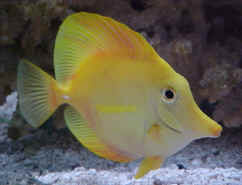 Another Yellow Tang with Black Spot 8/25/03 Hello I have a great 5-6" yellow tang but the other day I just discovered that the my fish is cover with very tiny sort of blackish or reddish dots. <Ahhh...yes. The Turbellarian work known as "Black Spot" disease> Its acting pretty normal but I am very concerned that it might be some sort of a disease. Would you perhaps know what are those symptoms are? I would really appreciate your help. By the way very great site. You guys are great. <do go to the home page www.wetwebmedia.com and use the Google search tool at the bottom of the page to search for this and various parasitic diseases. Use the phrase "black spot disease" first. You can also find in by navigating your way from the home page to many articles and FAQs on parasitic diseases. Advice on treatment lies therein. Best of luck. Anthony> White variety, yellow tang I recently saw and photographed what appeared to be a color variant yellow tang in shallow waters of southern Maui. It was all white except for yellow front dorsal, pectorals, pelvics, and eye rings. White caudal fin. U of Hawaii and Bishop Museum folks (so far) have never seen a similar color variant. <Neat. Me neither... but have seen other "koi" varieties over the years, there and in the trade> I can send the jpg if anyone is interested. Does it ring a bell for anyone? I see various references to white versions of yellow tangs on the aquarists sites. But this seems to be a different pattern. <Does. Do send and I'll post. Bob Fenner> Earl Byron