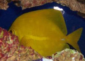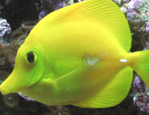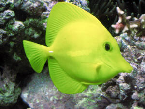 Hey! Questions of Yellow Tang. Yellow Tang Not So Yellow 6/27/07 Hello Crew, <Hi> I had a question to ask, I had just seen it a couple seconds ago, and I recall I've used your site to look for questions/answers before. Okay, here's my problem. I have a Yellow Tang and he seems to have turned white. He's definitely not the vibrant yellow that he was before, but he has a white line in the middle of his body. <Stress lines maybe.> Both on the side, and you can see his organs. <Not good.> I was hoping if you could help me, I'm not sure if it's the food, I'm going to try and see if I can find some plant food. He's eaten all of my plant that I had in my tank! <Sounds like it could be from diet, stress, or poor water conditions. Check your water parameter and make sure they are in line, make sure it is not being picked on by tankmates and has plenty of swimming room, and make sure it gets plenty of vegetable matter in its diet.> Hope you have a good day. Kind regards, Isabelle <And good day to you.> <Chris> Yellow Tang Health 6/5/07 First off, what a beautiful and informative site you all have here, I have been reading for hours. <Thanks> My tank is around two years old and I feel that I am still a hopeless novice. None-the-less there have been no sharp or major upsets in my 38 gallon tank for some time now. My problem is my yellow tang. When we bought him around 9 months ago (maybe more) he was sunshine yellow, the pride of our tank. Around 5 months ago there has been an ongoing problem. He has white marks that look like scratches I guess, that are systematically running around his gills, down his nervous receptors (a straight line down his sides) that end in a final diamond shaped dot at the base of his tail. This is an even pattern on either side. <Sounds like stress markings.> Other then the white marks he has no other discoloration, there is some fraying of the dorsal fin, but that has stopped and there is no sign of an on going problem in that area. We have tried what feels like everything. He has purple and green Nori, Zoe vitamins, Marine diet, brine shrimp, zoo plankton etc. as well as a grounding rod to eliminate the chance of stress caused by small electrical charges in the tank. He eats very well, is very active and dominates the tank. His tank mates are two small clowns, one damsel, a cleaner shrimp and a fire shrimp. Our water quality has a clean bill of health (most of the time.) Thank you in advance for any insight you may be able to give me. -Aisha <I think you are seeing the signs of keeping the tang in what is quite frankly a way too small of a tank. The lines you are seeing are most likely stress markings, caused by not having enough room to move about. Realistically you need a tank at least double in size to get to the minimum needed to keep this fish healthy over its life.> <Chris> Yellow Tang, hlth. most folks would list as/in 5/23/07 Hi, I have a 60 gal. fish only aquarium with a wet/dry filter, Ocean Clear canister and in-sump skimmer. Among my fish is a yellow tang that I've had for 8 years. Unfortunately, during the early years of my hobby, I made many errors and had glitches which almost killed the tang on quite a few occasions. She's now as healthy as a horse but has sustained upper and lower fin loss which has not regenerated (about 2-3 years since it happened). I was wondering if there are any antibiotics that might help her regain some or all of this loss. Thanks, Rich Aylward <Mmm, not if the damage is "too far gone"... too deep/close to the fin spine origins... Bob Fenner>