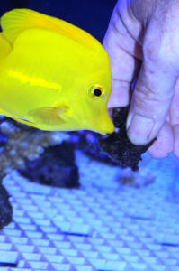 Yellow tang not eating. Env. 10/7/15 The Stubborn Tang; not fdg. post Cu exposure