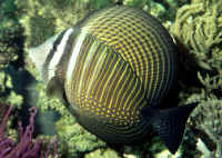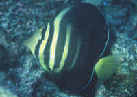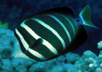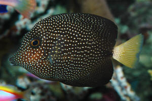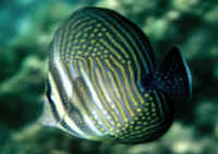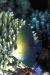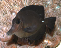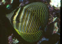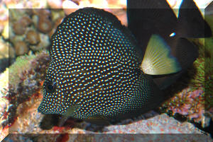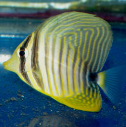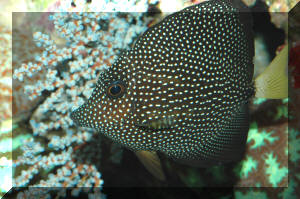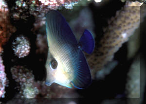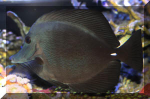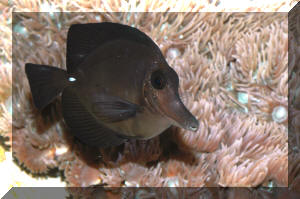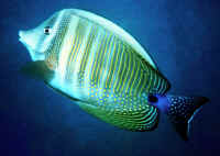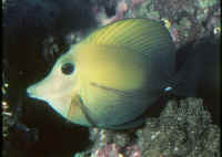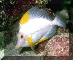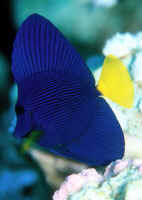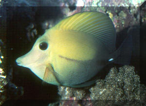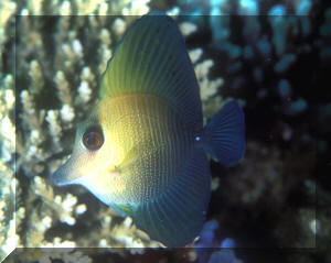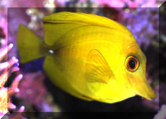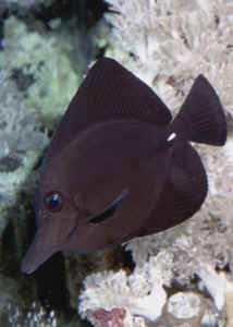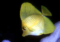 Range: Sailfin tangs are found on shallow reefs from the east coast of Africa northward to the Red Sea, over the broad span of the Indo-Pacific and Oceania, eastward to the Hawaiian Islands. Not found in the Atlantic or western Pacific. Size: Having dived with these fishes around the world's tropical seas, I've seen how big Zebrasoma get. Think you've seen big tangs? Get out your ruler; Yellows attain eight inches, Purple and Black Longnose' over a foot, and Desjardin's fifteen inches in total length. Selection: General to Specific I use five criteria when judging the acquisition of Zebrasoma; body conformation, size, color, behavior, and the length of time they've been in captivity. 1) Body Conformation: Appearance of a sunken stomach is not of itself an accurate indication, but healthy, freshly collected specimens of tangs appear well rounded. The upper body, above and behind the eyes should not be "shrunk in", or show loss of color. About the scalpel-like caudal peduncle spines or "tangs": Often enough, conscientious collectors will snip off the peduncular spines of surgeons to prevent net fouling and damage from crowding/fighting. Don't be alarmed at this; they will grow back. 2) Size Range: The minimum purchase size for the genus I peg at about three inches in length for adaptability, maximum at five. 3) Color: From studying you should know the "normal" looks of a healthy specimen. Color ought to be intense and uniform. Zebrasoma display quite different stress, fighting, nighttime markings, and often-becoming barred, blanched in color. Avoid stressed specimens, and any showing red, eroded, or blotchy markings. 4) Behavior: Sailfin tangs that have been captured, transported, acclimated and kept properly are active and curious about their environment. Avoid sulking, sedentary individuals having "private parties" at the bottom or top of their aquarium. Is the specimen feeding? On the types of foods you'll be offering? Make sure before taking it home. 5) Time in Captivity: A good week or two should go by before taking new surgeons from your dealer. This period serves at least three critical functions; cleansing the fish of external parasites, acclimating it to aquarium conditions, testing to see if it can/will recover from capture/transport/captivity traumas. Environmental: Conditions Habitat Though Zebrasoma are somewhat smaller and less free-ranging than other Acanthurid species, these tangs require large amounts of tank space to be at their best. A fifty-gallon tank is the absolute smallest I'd keep one in. For all your livestock's sake, maximum nook and cranniness should be provided for ducking in and out of vision and harm's way. Acroporid coral skeletons are especially appreciated. Chemical/Physical Of all the tangs, the Zebrasoma species display the most tolerance for variable water conditions. Nevertheless pH should be maintained between 8.0 and 8.4., temperature kept ideally in the mid-seventies; to low eighties F. maximum. For cost, disease and maintenance considerations, many folks keep these fishes at low specific gravities (1.020 and even lower). This generally works out, except for the Z. xanthurum collected out of the Red Sea appreciate a higher, more constant (1.025-27) spg. Filtration Talk about a paradox On the one hand Sailfin tangs require stable, aged systems with diatom, green algal growth and detritus... on the other, they demand low waste loads and high dissolved oxygen. Be sure about this by providing strong water movement (four plus passes per hour) and vigorous aeration. Behavior: Territoriality Sailfins are better to keep just one individual of one species to a system. They can and will fight with their species and other tangs, seriously damaging other similar appearing fishes, even in tanks of hundreds of gallons. Should you be determined to keep more than one Zebrasoma or con-specifics together, do purchase them as a group, from the same dealer's tank, and introduce them all at once. Per tang territoriality, these fishes should be placed last, affording their tank-mates time to assert space for themselves. I differ with other authors as to the relative fierceness of Zebrasomas with other fishes. As a group, they are the least dangerously agonistic; almost always their face-offs are more for show than go, the fish retreating or allowing retreat in systems of adequate size, un-crowded space, with plenty of cover. But I would be remiss to not mention that, as usual, there is no substitute for careful observation. Casual, time to time "nose to tail-offs", of short duration are to be expected. Prolonged battles demand immediate separation of warring parties, or loss of at least one. Introduction/Acclimation Most often utilized in "community" fish-only systems, I have seen small Sailfin tangs in reef systems to advantage. For color and algae picking Zebrasoma are hard to beat... but be forewarned; they are not above sampling non-vertebrates and can gain size surprisingly quickly; and of course will eat most algae, including Caulerpa. These fishes, as all tangs, are best placed near last to ensure aging and stability of the system. Given plenty of room and hiding spaces your Sailfin tang should not be overly intimidated by any but the worst bully tank-mates. Predator/Prey Relations Though they are of spiny-fin, proficient with their razor-like peduncle scalpels, and can be ciquatoxic (poisonous for fish or human consumption), predatory fishes consume Sailfins. Measure grouper, moray and lionfish mouths twice before introducing Zebrasoma. Reproduction, Sexual Differentiation: Except for Z. scopas where males noticeably change color during spawning and are quite a bit larger than females, and males of Z. rostratum which show white setae (bristles) before their peduncular spines, Zebrasoma tangs show little sexual dichromatism or dimorphism (color or structural differences between males and females). Spawning by Zebrasoma species occurs by pairs and schools, with two