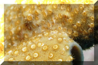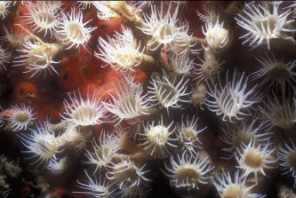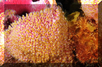 1/4" diameter polyps. Encrust several species of sponges. Here
