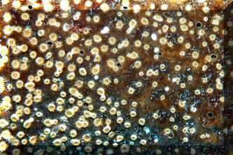 Zoanthid. Small (1/8" diameter) brown to yellowish brown to greenish tentacled polyps,
